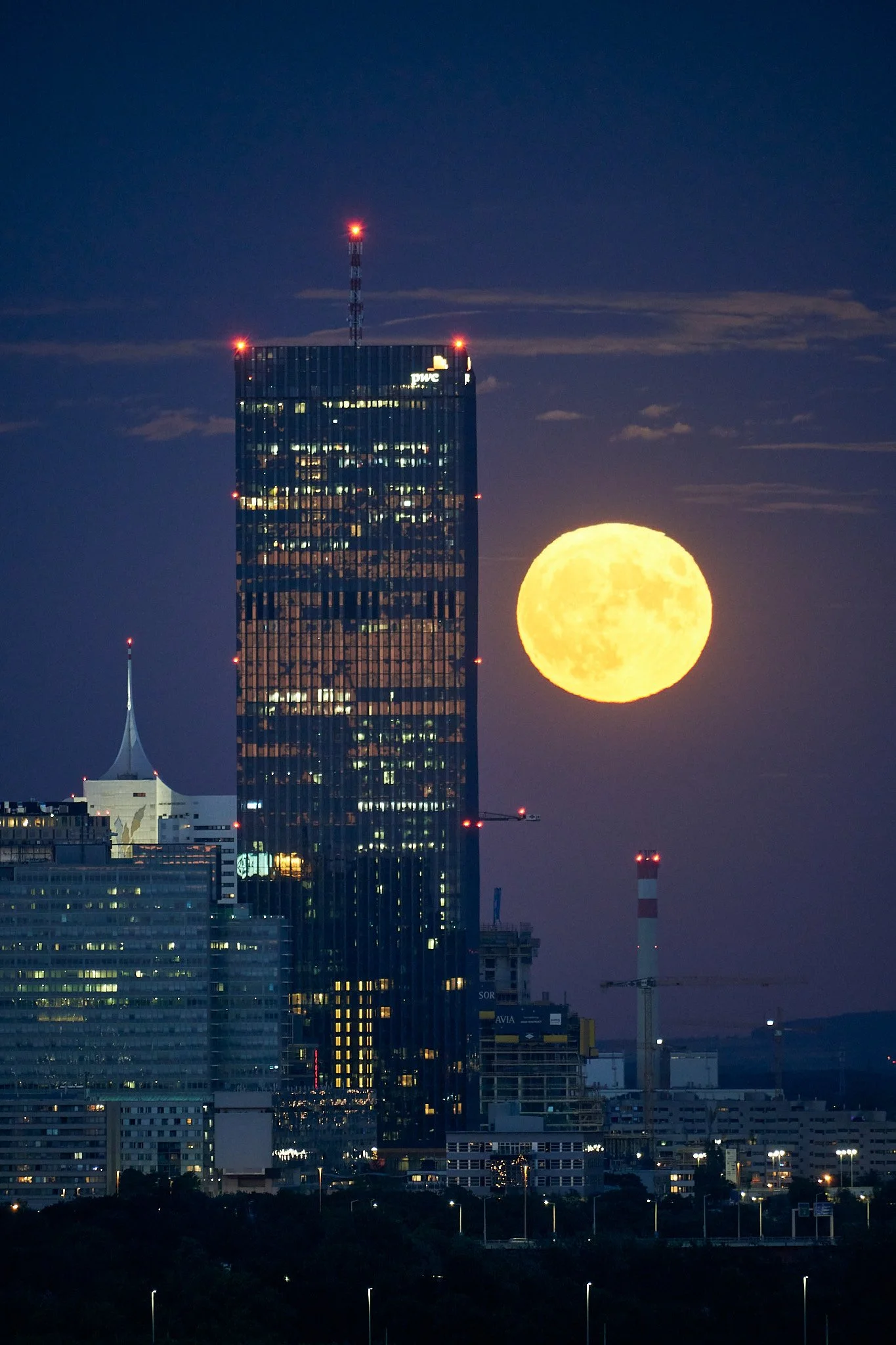 Super Moon behind DC Tower 1, Vienna, Austria, July 2022